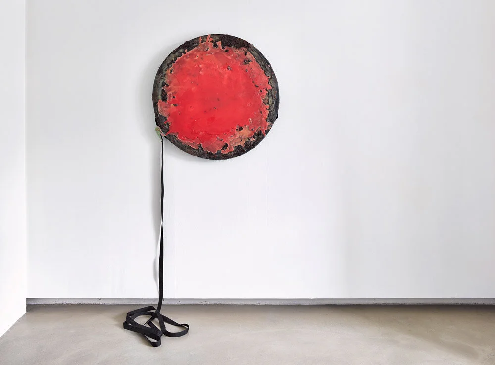 "Man sieht die Sonne langsam untergehen und erschrickt doch, wenn es plötzlich dunkel ist. (You see the sun slowly setting and yet you are shocked when it‘s suddenly dark.)" 2020, iron ring, black cotton cloth, lashing belt (black), pitch, candle wax, Ø 85 cm x 7 cm