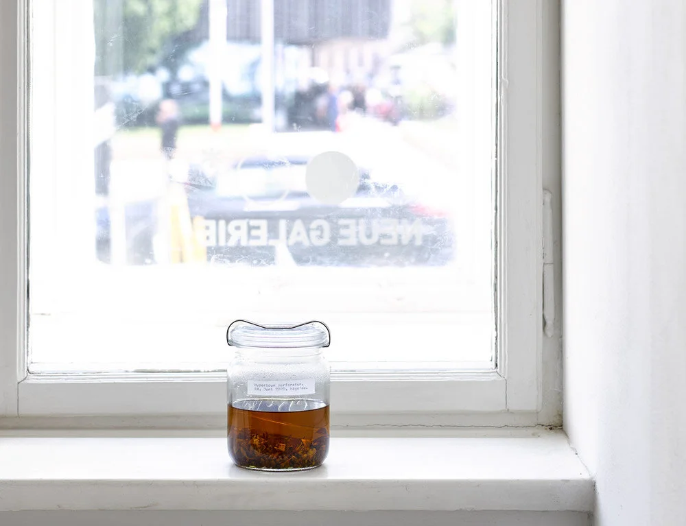 "Hypericum perforatum. 24th June 2020. Hägerau." 2020, olive oil, St. John’s wort, glass Ø 20 x 15 cm