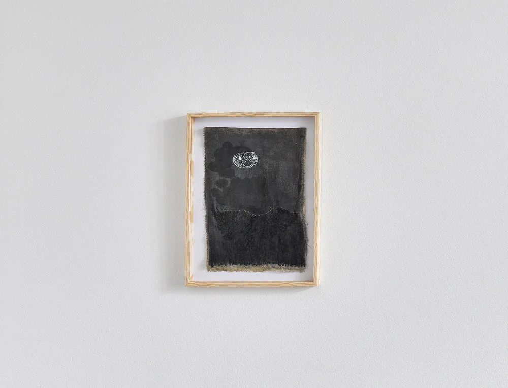 "E.T. - The Believer." 2020, graphite on linen, black and gold thread; white Gelly Roll pen, marmot oil; 25 x 34 cm. Pineframe, 30 x 39 x 2.5 cm