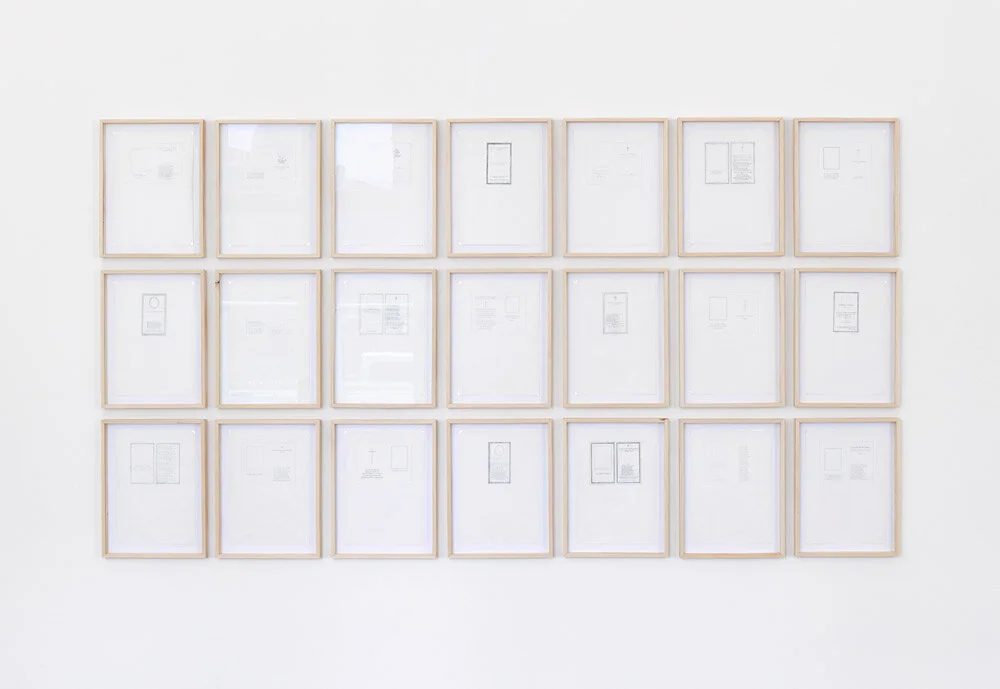 "Historie einer Sammlung über das Leben (History of a collection about life)" 2020, graphite on tracing paper, 21 x 29.7 cm. Framed in spruce, each 27 x 36 x 2.5 mm, corners in beechwood, photo corners, series